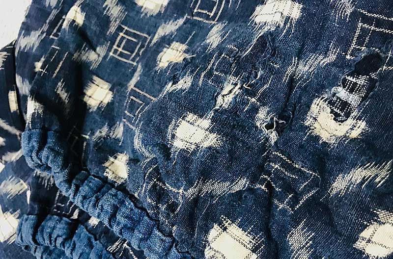 Ett traditionellt japanskt plagg, hanten, med shiborimönstrad insida.